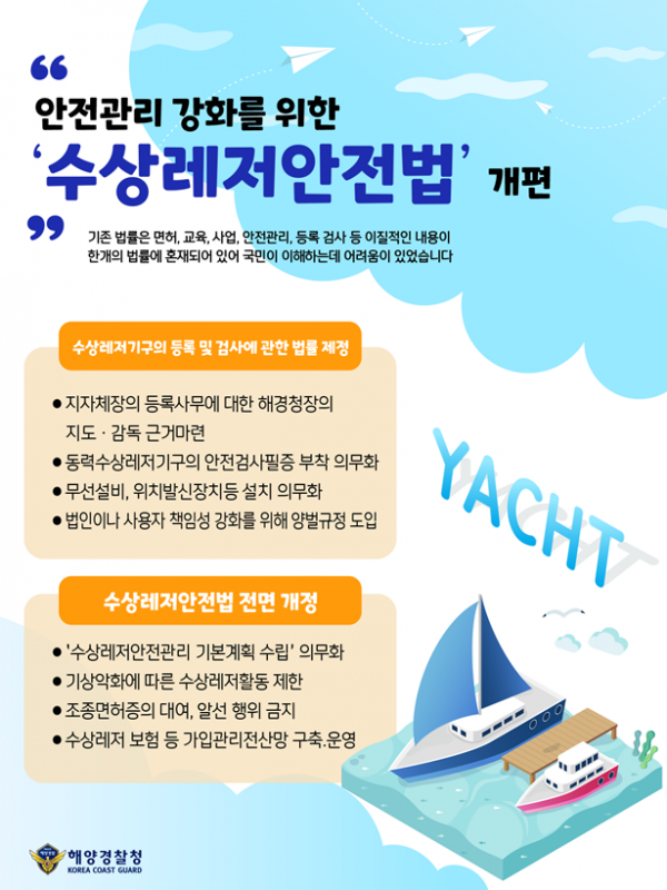 전부개정된 ‘수상레저안전법’ 에서는 미래 정책환경 변화를 반영한 수상레저안전관리 기본계획 수립 조종면허증의 대여·알선행위 금지 국민편의를 위한 보험 등 전산망 구축·운영 등이 신설됐다.