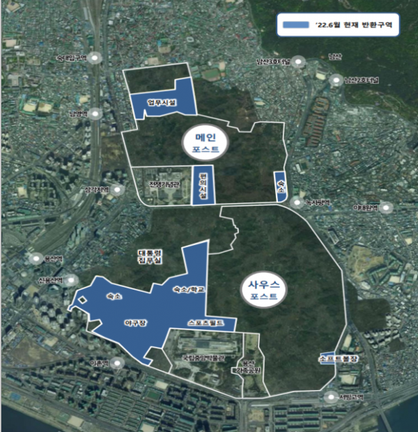 우리 정부는 2021.7월 한미간 합의에 따라 금년 초까지 용산기지 약50만㎡ 구역 반환을 추진해 왔으며 그 결과 지난 2월 및 5월에 총 53.3만㎡ 구역을 반환 받았다.