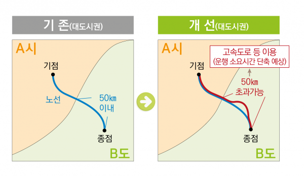 광역급행·직행좌석형 시내버스 운행거리는 ‘대도시권 광역교통 관리에 관한 특별법’에 따른 대도시권 내 기점 행정구역 경계로부터 50km로 제한되어 있으나, 고속도로 등을 이용해 소요시간 단축이 가능한 경우에는 50km 거리를 초과할 수 있도록 개선했다.