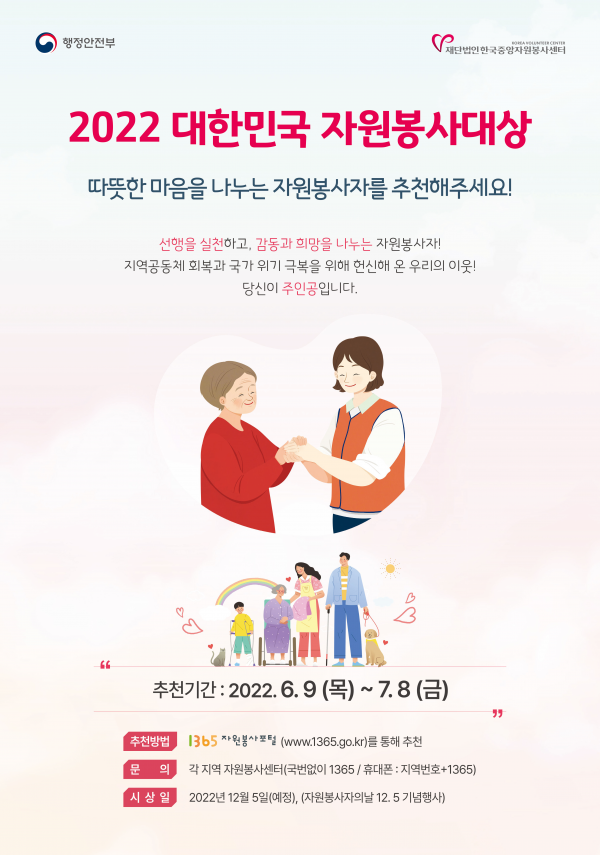 [세종타임즈] 행정안전부는 어려운 이웃을 돕고 지역사회를 위해 헌신해온 유공자 발굴을 위해 6월 9일부터 7월 8일까지 ‘2022년 대한민국 자원봉사대상’ 후보자를 공모한다고 밝혔다.