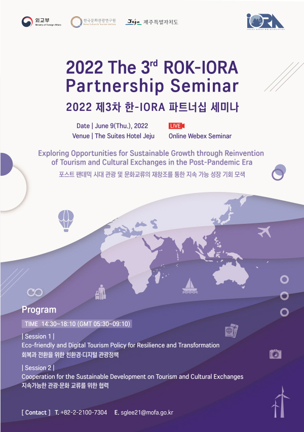 금번 세미나는 IORA 사무국 및 회원국 정부 인사, 관련 민간 전문가들을 초청해 IORA 8대 우선협력분야 중 하나인 관광·문화교류 분야에서의 실질 협력 강화 방안을 모색하고자 한다.