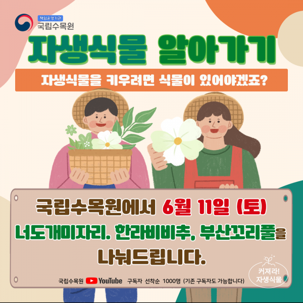 ‘자생식물’은 우리나라에 원래부터 살고 있던 토종 식물을 의미하는 것으로 행사에서는 자생식물 3종 1,000본을 국립수목원에 입장한 국민에게 선착순으로 나눠준다.