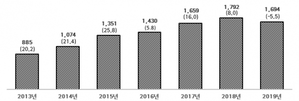 최근 7년간 보건산업 분야 창업기업은 총 9,885개이고 연도별 창업기업 수는 증가추세이며 2013년 885개에서 2019년 1,694개로 약 2배 증가했다.