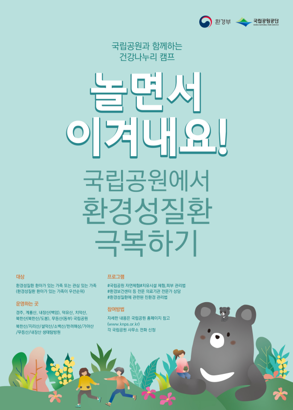 [세종타임즈] 환경부와 국립공원공단은 아토피·알레르기비염·천식 등 환경성질환을 앓고 있는 어린이와 그 가족이 참가하는 ‘국립공원 건강나누리 캠프’를 운영한다.
