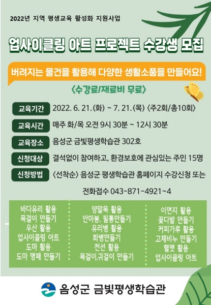 [세종타임즈] 음성군은 업사이클링 아트 프로젝트 수강생을 오는 17일까지 모집한다.