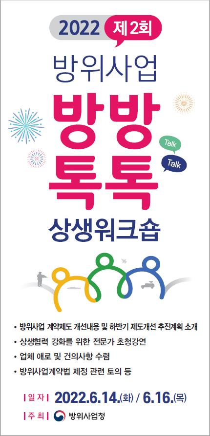 ‘방방톡톡 상생 워크숍’은 전국 방방곡곡을 순회하며 방위사업청과 방산업체 간 Talk-Talk을 통해 상생방안을 모색하는 행사다.