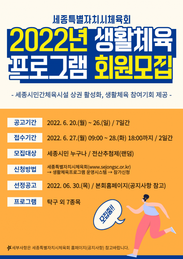 하반기 생활체육프로그램 강습회 수혜자 모집 공고는 6월 20일부터 6월 26일까지 7일간 세종시체육회 홈페이지에 공시되며 6월 27일부터 이틀간 접수가 진행된다.