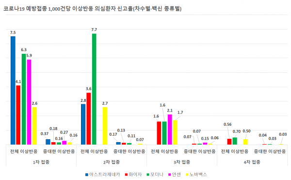 백신별 신고율은 아스트라제네카 백신 0.54%, 화이자 백신 0.31%, 모더나 백신 0.45%, 얀센 백신 0.59% 0.21%), 노바백스 백신 0.15%이었다.