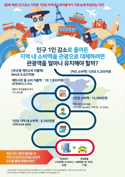 관광 대체소비로 보면 제천은 감소인구 1명당 숙박여행 34명과 당일여행 71명, 신안은 숙박 6명과 당일 14명이 필요한 것으로 나타났다.