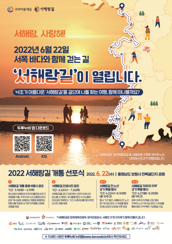 걷기여행 안내 누리집인 ‘두루누비’를 활용해 서해랑길 1개 노선 이상을 완보한 사람에게 추첨을 통해 경품을 제공하며 서해랑길에서 발견한 인생사진 장소를 누리소통망에 소개하면 호응도에 따라 경품을 제공하는 ‘나만의 서해랑길 인생사진 공모전’도 진행한다.