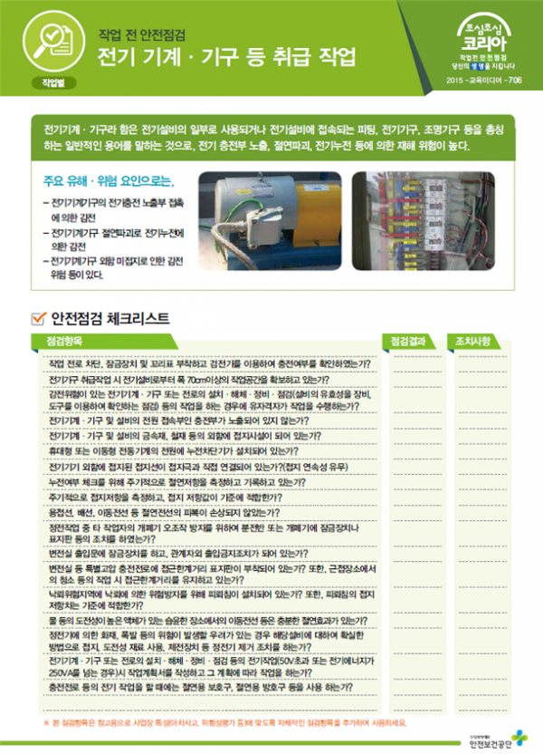 이번 점검은 장마 등 계절적 요인을 앞둔 상황에서 제조업에 집중하면서 더불어 감전과 화재 및 폭발사고 예방에 대한 안내도 병행하고 있다.