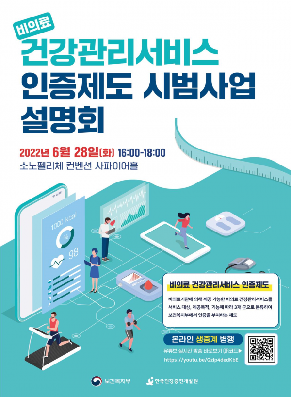 인구 고령화로 인해 만성질환 환자가 늘어나고 디지털 헬스케어 기술 발달로 건강관리서비스에 관한 관심이 높아지는 가운데, 보건복지부는 소비자가 안심하고 서비스를 이용할 수 있도록 건강관리서비스 인증제 시범사업을 통해 서비스 기능, 효과 등을 평가해 인증하고 인증받은 서비스 및 기업정보를 공개한다.