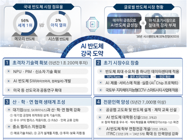 인공지능반도체 첨단기술 연구개발에 예타사업을 포함해 향후 5년간 1조 200억원을 투입하고 미국 등 선도국과 공동연구를 확대한다.