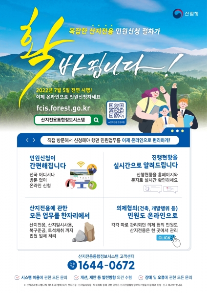 [세종타임즈] 산림청은 산지전용 관련 인허가 접수부터 허가증 발급까지 모든 절차를 처리할 수 있는 ‘산지전용통합정보시스템’ 온라인 서비스를 오는 7월 5일부터 전면 시행한다고 밝혔다.