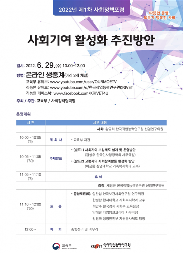이번 공개토론회는 코로나19 상황을 고려해 온라인으로 실시간 생중계되며 교육부 유튜브 및 한국직업능력연구원 유튜브, 페이스북을 통해 국민 누구나 접속해 시청할 수 있으며 토론회 발표 내용은 행사 종료 후, 사회정책 누리집에서 확인할 수 있다.