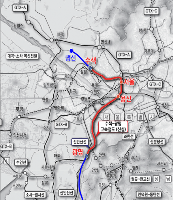수색~광명 고속철도 건설사업은 광명에서 용산, 서울역을 거쳐 수색차량기지까지 총 23.6km 구간의 고속철도 전용선을 지하에 건설하는 사업으로 연장 23.6km, 사업비 2조 4,823억원 ‘16년 제3차 국가철도망계획에 신규사업으로 반영된 이후 사업계획을 구체화해 이번에 예비타당성조사에서 통과됐다.
