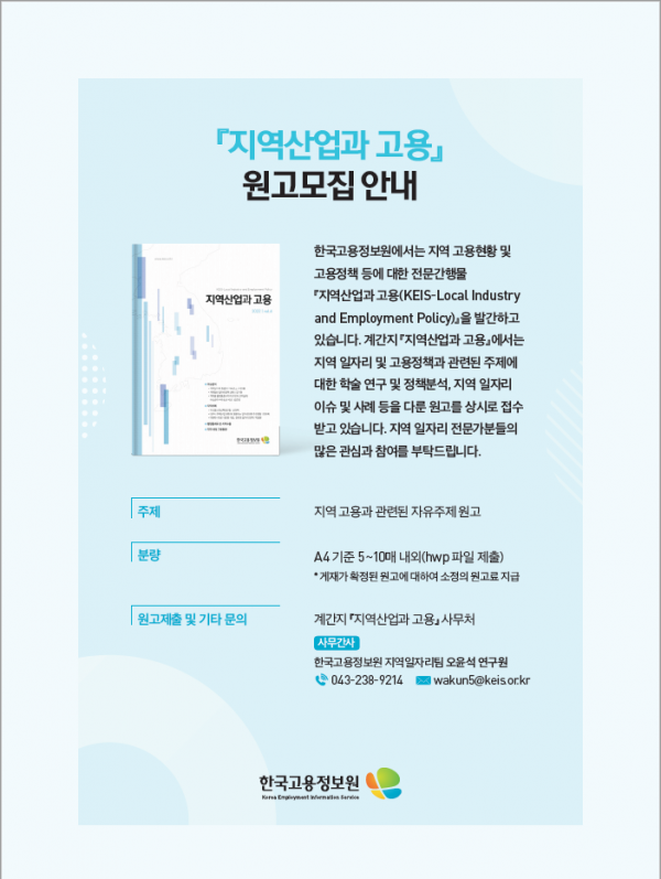 ‘지역산업과 고용’여름호는 `지역고용이슈'에서 전국 17개 시도 고용전문관을 대상으로 청취한 지역-산업별 일자리 현안 및 변화도 제공한다.