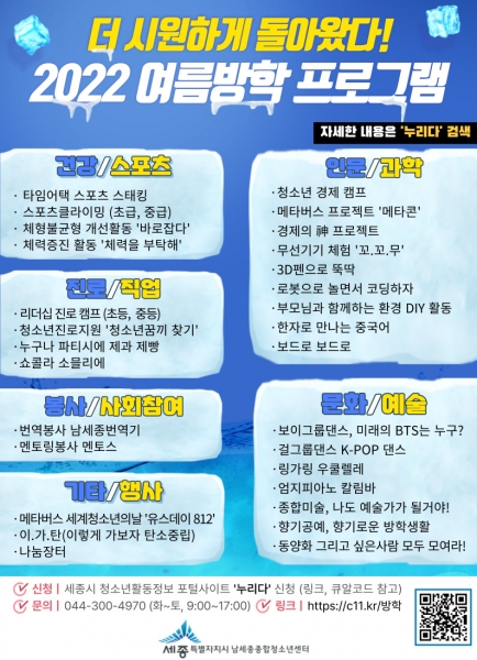 [세종타임즈] 세종특별자치시가 여름방학을 맞이해 오는 21일부터 8월 13일까지 지역 청소년 1,124명을 대상으로 남세종종합청소년센터에서 여름방학 프로그램을 운영한다.