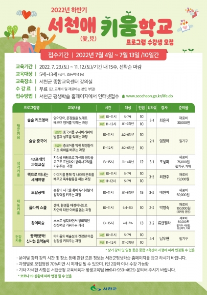 5세부터 13세까지의 유아와 초등학생을 대상으로 운영하는 하반기 서천애 키움학교는 7월 23일부터 11월 12일까지 15주 동안 매주 토요일 서천군종합교육센터 강의실에서 운영된다.