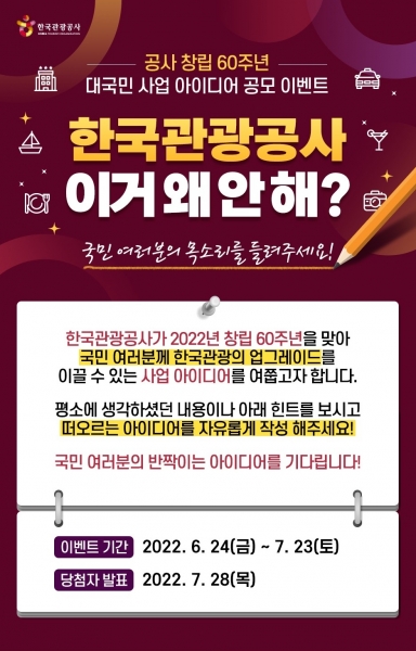 [세종타임즈] 올해로 창립 60주년을 맞은 한국관광공사는 국민이 체감할 수 있는 신규 관광서비스 발굴을 위한 대국민 사업 아이디어 공모 이벤트를 7월 23일까지 1개월 간 실시한다.