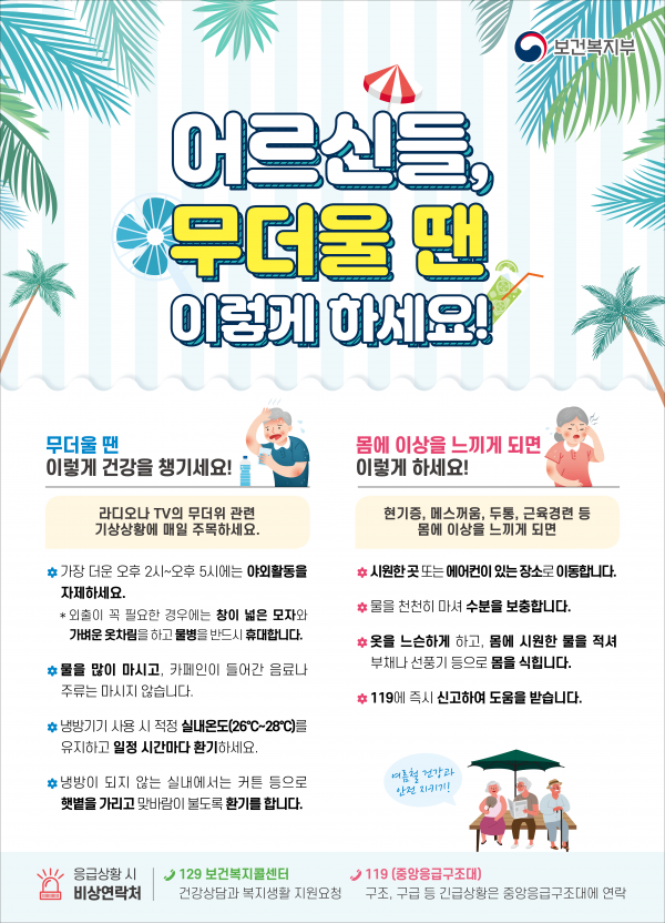 더불어, 전국 경로당에 월 10만원 냉방비를 지원하고 민간기업·단체 후원을 통해 온열질환에 취약한 노인 대상으로 냉방용품·식품키트 등을 전달했다.