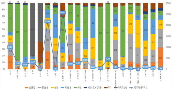 의원 41,988명, 종합병원 20,316명, 상급종합병원 20,236명 순으로 근무하는 것으로 확인된다.