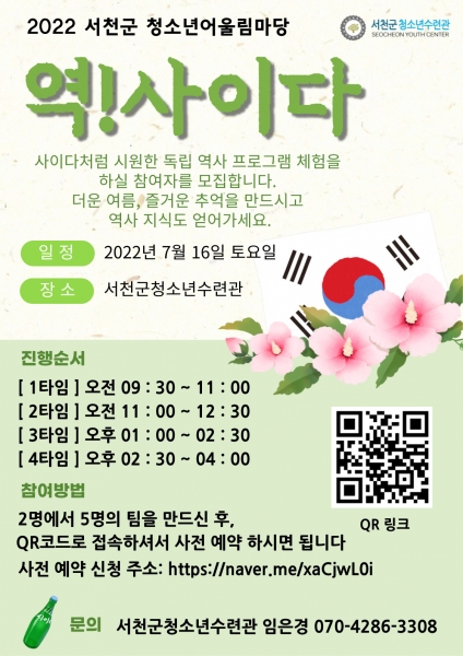 [세종타임즈] 서천군청소년수련관이 서천군 청소년 어울림마당의 일환으로 오는 16일 ‘역사이다’ 프로그램을 진행한다고 밝혔다.