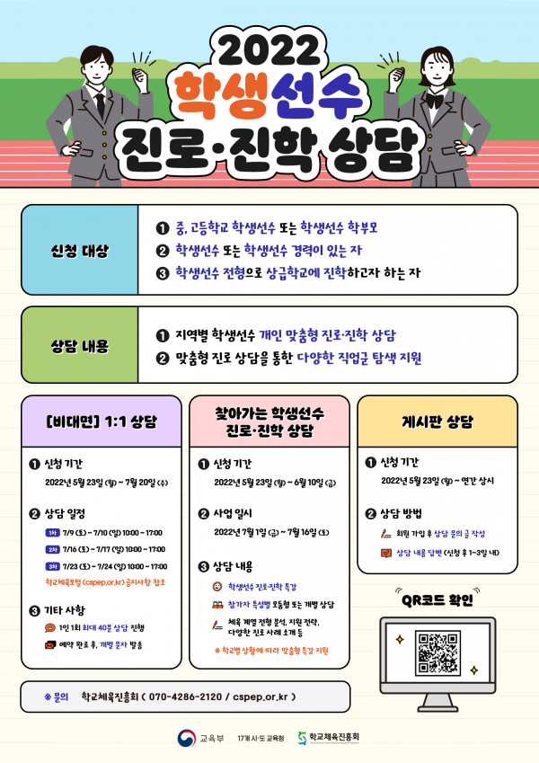 [세종타임즈] 교육부는 17개 시도교육청, 학교체육진흥회와 함께학생선수의 진로를 고민하고 맞춤형 진로상담을 통한 다양한 직업군 탐색 기회 및 진로 개발을 지원하기 위해 ‘2022년 학생선수 진로·진학상담 프로그램’을 운영한다.