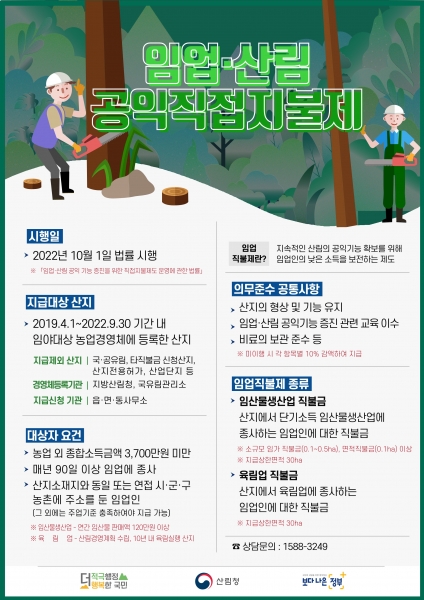 주요원 임업직불제긴급대응반 과장은 “임업인의 소득안정을 위해 도입한 임업직불제가 조기에 안착되고 임업인들이 더 편리하게 직불금을 받을 수 있도록 현장의 목소리에 더욱 귀 기울이겠다”고 말했다.