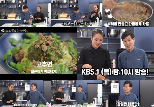 첫 번째로 선보인 레시피는 중독성 강한 매운맛을 자랑하는 고추면. 고추면을 개발한 정지선 셰프는 “왕병호 셰프, 작가들과 밤새 고추를 칼로 다진 뒤 구웠다”고 비하인드를 살짝 공개했다.