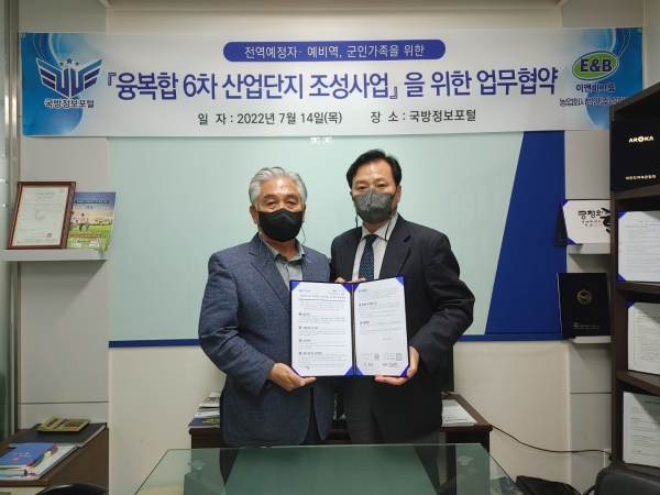 [세종타임즈] 지난 7월 14일 국방정보포털과 E&B그룹 농업회사법인 은 전역을 앞둔 전역예정자와 전역 후 취업과 창업의 어려움을 호소하는 예비역을 위해 민/관/군이 협업해 융복합 6차 산업단지를 조성해 취업과 창업은 물론이고 주택과 사업장까지 지원하는 ‘융복합 테마마을 조성사업’을 위해 업무협약식을 체결했다.