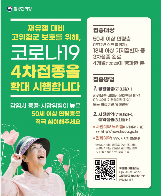 4차 예방접종 대상자는 50대 주민 중 3차 접종 후 4개월 경과자 기저질환이 있는 18세 이상 성인 장애인·노숙인 시설 등 감염취약 시설의 입원·입소자이다.