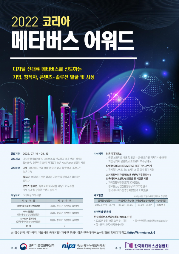 또한, 수상자에게는 국내 최대 메타버스 행사인 대한민국 메타버스 페스티벌에 참가해 성과를 홍보할 수 있는 기회 등을 제공할 예정이다.