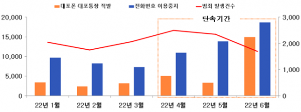 전화금융사기 범행에 핵심적으로 이용되는 범행수단 8가지를 선정해 2022년 4월부터 6월에 특별단속 결과 범행수단 총 37,226개·불법 환전금액 585억원을 적발하고 3,627명을 검거했다.