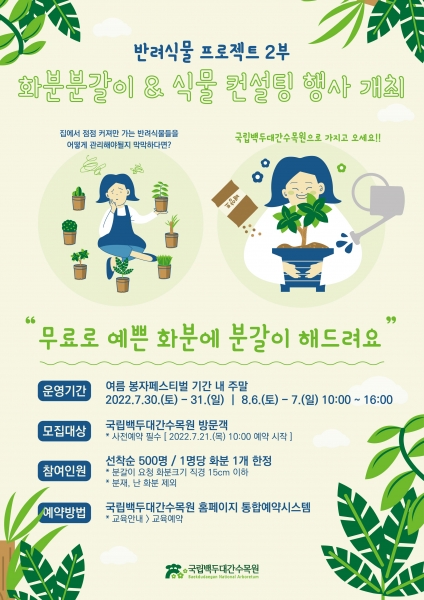 이종건 국립백두대간수목원장은 “건강한 반려식물 가꾸기를 통해 생활 속 정원문화를 행복하게 누릴 수 있길 바란다”고 말했다.