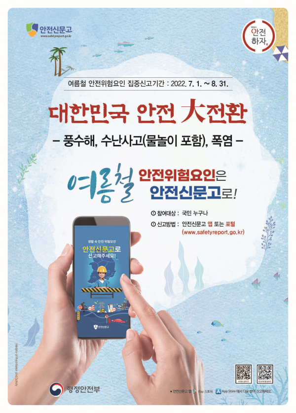 안전신고 대상은 하천·비탈면·침수지역 등 풍수해 우려 지역, 물놀이장·유원지·야영장·휴양림 등 피서지와 피서지 외 지역에서 발생하는 수난사고 폭염에 따른 취약계층·시설관리 등 여름에 발생하기 쉬운 위험요인이 모두 해당된다.