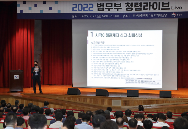 [세종타임즈] 법무부는 7월 22일 과천청사 지하대강당에서 국민권익위원회 부패방지국장과 청렴연수원장을 초청해 장·차관을 비롯한 고위공직자와 법무부 전 직원을 대상으로 이해충돌방지법 교육 등 청렴라이브 행사를 개최했다.