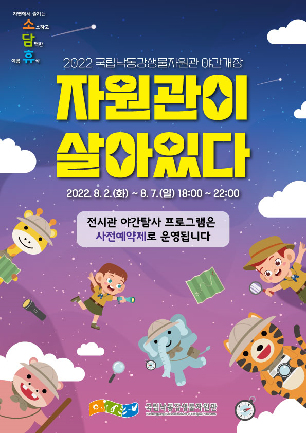 특히 이번 야간 무료 개방기간 동안 선보이는 ‘자원관이 살아 있다’ 체험과정은 7월 25일 오전 10시부터 국립낙동강생물자원관 누리집 내의 통합예약시스템에서 하루 4회씩 회당 40명의 가족을 대상으로 선착순 사전예약을 받는다.