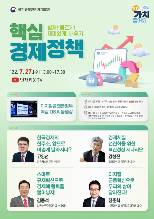 국가공무원인재개발원은 27일 ‘핵심 경제정책, 쉽게 빠르게 재미있게 배우기’를 주제로 '7월 온세상 지식탐구생활, 안녕 가치 들어요' 공개강좌를 개최한다고 26일 밝혔다.