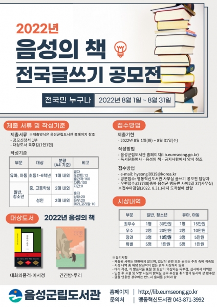 [세종타임즈] 음성군립도서관은 다음 달 1일부터 31일까지 ‘2022년 음성의 책 전국 글쓰기 공모전’을 개최한다.