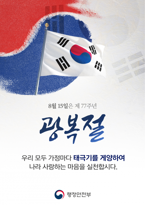 한편 행안부는 온 국민 태극기 달기 운동을 전개해 광복절의 의미를 되새기고 경축 분위기를 조성할 예정이다.