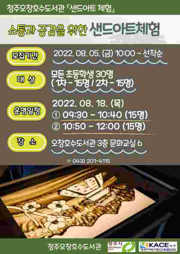 이번 샌드아트 체험은 청주지역사회교육협의회 주관 충청북도교육청의 지원으로 오는 8월 18일 9시 30분부터 12시까지 방학을 맞은 초등학생 30명을 대상으로 오창호수도서관 3층에서 진행한다.