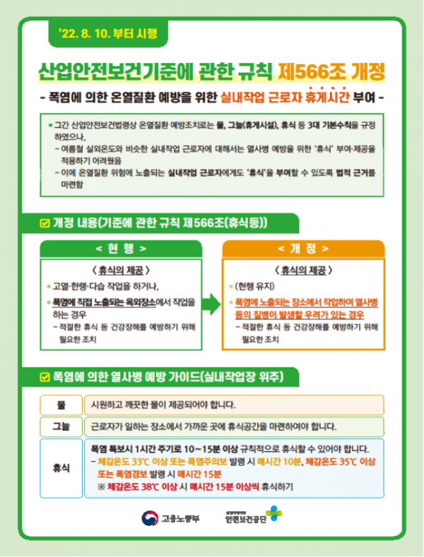 이번 개정으로 실외작업장뿐만 아니라 실내작업장 근로자에게도 휴식 제공이 의무화됨으로써 열사병 등 온열질환 예방을 위한 근로자 보호제도가 보다 두터워졌다.