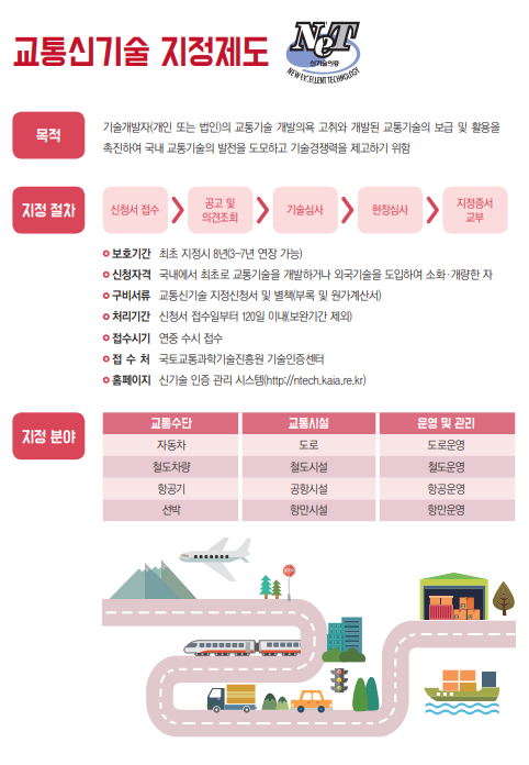 한편 교통신기술 제도는 2010년부터 시행해 온 제도로 국내에서 최초로 개발되거나 외국에서 도입 후 개량한 교통기술을 평가해, 신규성·진보성·경제성·현장적용성 및 보급·활용성이 우수한 기술을 국토교통부 장관이 인증해왔다.