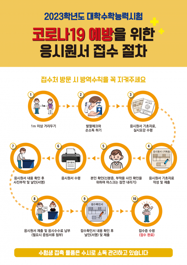 수험생 또는 대리접수자는 접수처 방문 시 마스크 착용, 손 소독 실시, 접수자 간 거리 유지 등 방역 수칙을 반드시 준수해야 하고 접수처 관계자의 안내와 요청사항에 성실히 응해야 한다.