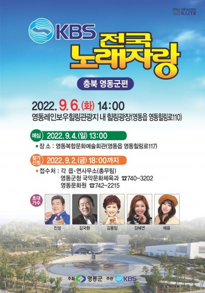 영동군은 다음달 4일 영동복합문화예술회관에서 예심을 한 후, 같은 달 6일 레인보우힐링관광지 내 힐링광장에서 ‘KBS 전국노래자랑’ 영동군편을 공개 녹화한다고 밝혔다.