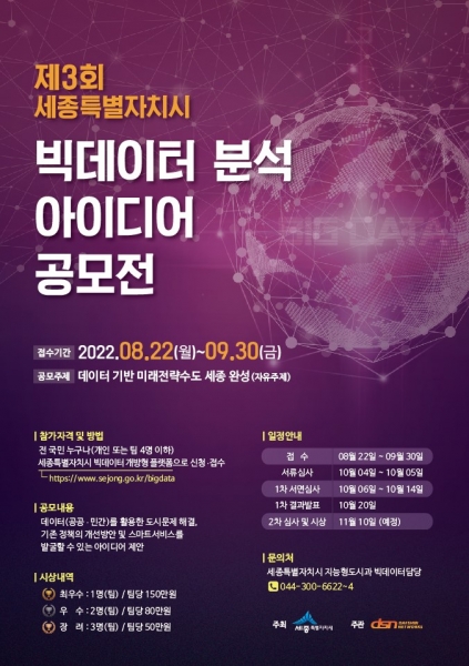 [세종타임즈] 세종특별자치시가 22일부터 오는 9월 30일까지 ‘데이터기반의 미래전략수도 세종 완성’이라는 주제로 전 국민 대상 ‘제3회 빅데이터 분석 아이디어 공모전’을 개최한다.