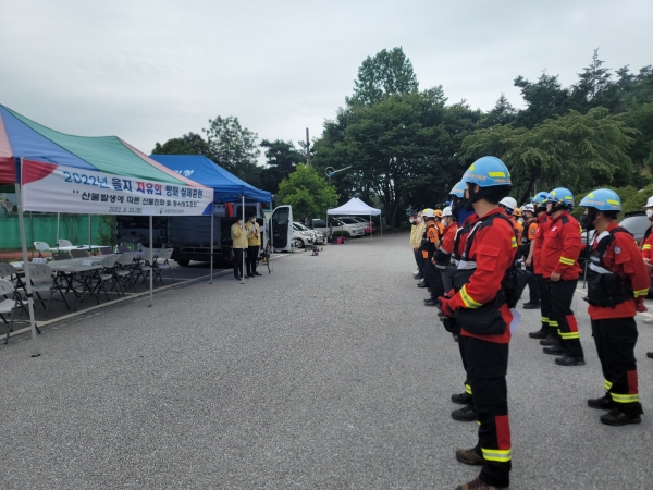 이날 훈련은 전시 상황에서 산불이 발생해 청사 화재로 번지는 상황을 가장하고 현장지휘본부 운영, 산불 진화 헬기 투입, 소산이동 훈련 및청사 화재 진압 등의 훈련을 진행했다.