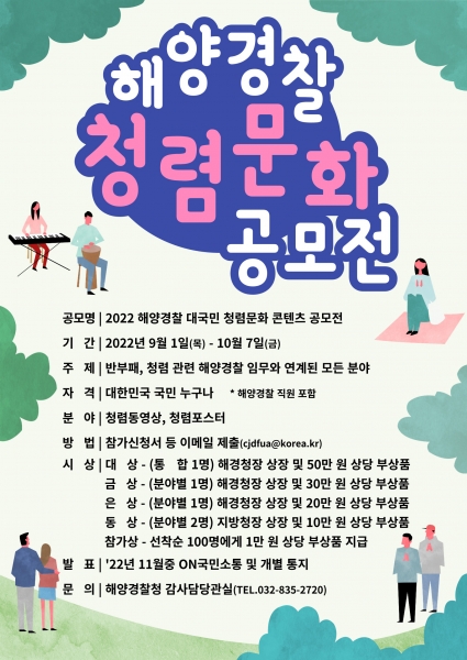 해양경찰청 관계자는 “본 공모전을 통해 국민과 해양경찰이 함께 소통하는 청렴문화 페스티벌로 조성되기를 바란다”고 밝혔다.