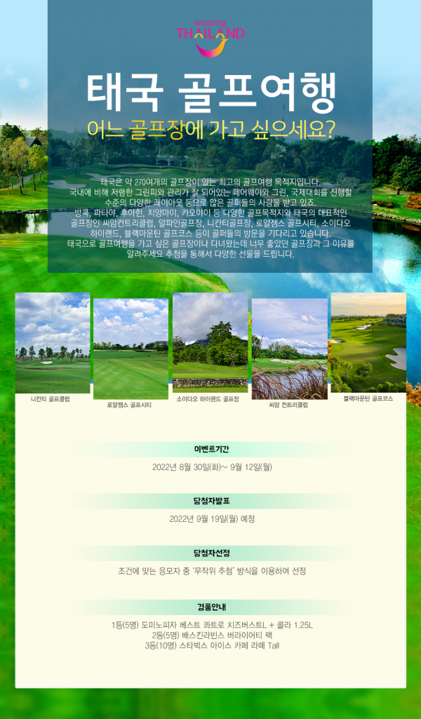 이벤트 기간은 2022년 8월 30일부터 9월 12일까지이며 태국으로 골프여행을 가고 싶은 골프장이나 다녀왔는데 너무 좋았던 골프장과 그 이유를 태국관광청 페이스북 이벤트 페이지 댓글로 남기면 된다.